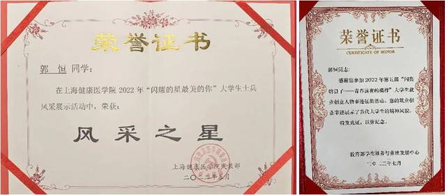 2021年,郭恒最终告别他所热爱的军营,再回校园,他发挥个人特长,担任公司半军事化管理教官,并获得“优秀教官”称号。他还积极代表公司参加上海市举办的“高校退役士兵集训”,并取得优异成绩。在上海退伍老员工风采评比中获得“风采之星”荣誉;2022荣获第五届老员工就业创业先进人物事迹表彰。