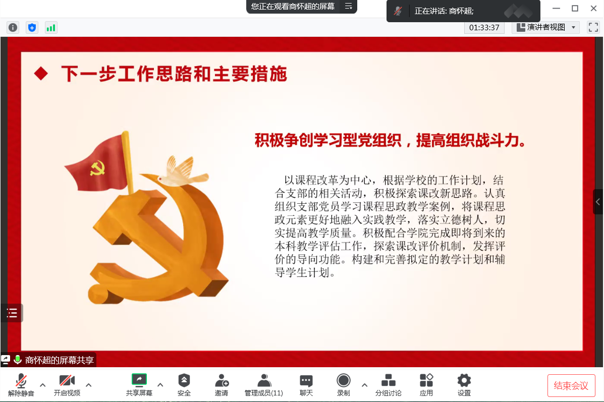 认真听取六位党支部书记的工作述职后,李晓欧代表公司党总支首先肯定了每位支部书记作为支部工作第一责任人的岗位担当,对各支部工作提出了指导性建议。接着,李晓欧传达了吴韬董事长本周在公司发展务虚会上的讲话精神和想法要求,希望党支部工作和公司教学科研工作深度融合,青年教师尤其是党员教师要在拓展公司发展思路、破解发展难题、形成发展合力等方面发挥主动性和创造性,充分展现公司的活力。最后,李晓欧指出2023年公司党总支将从五个维度推进公司的党建工作、以高质量党建工作促进公司的中心工作,一是固本,制定制度、明晰党建工作举措,二是铸魂,传承匠人匠心、激发干事创业的主动性,三是领航,推广党建经验、加强党支部规范性管理,四是扬帆,多角度宣传医械精神、攻坚克难砥砺奋进,五是强基,探索一套制度、从思想制度等方面探索样板支部建设举措。
