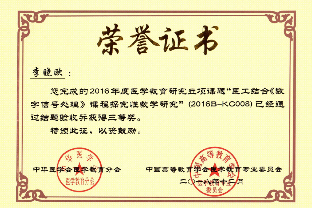 4月5日,李晓欧老师完成的2016年度医学教育研究立项课题“医工结合《数字信号处理》课程探究性教学研究”(2016B-KC008)通过结题验收,并获得中华医学会医学教育分会和中国高等教育学会医学教育2016年度医学教育研究立项课题三等奖。