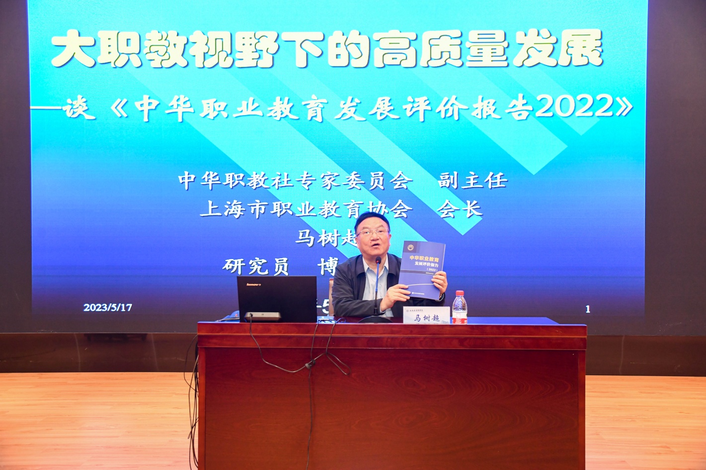 主题报告环节,中华职业教育社专家委员会副主任马树超做“大职教视野下的高质量发展——谈《中华职业教育发展评价报告(2022)》”报告,从职业教育发展与社会感受的困惑、职业教育发展的第三方评价、机遇与挑战:宏观环境与资源评价、对职业教育发展评价的第三方观点、对职业教育高质量发展的分析与建议、有效举措:探索省城体系建设改革新模式、双师型教育团队建设是高质量的基础、多元主体协同创新是高质量发展关键等8个方面论述职业教育高质量发展,强调“职业教育高质量发展并非仅仅体现在学历高或层次高、项目多和获奖多,而应主要体现在面向合适的员工提供适合的教育上”。