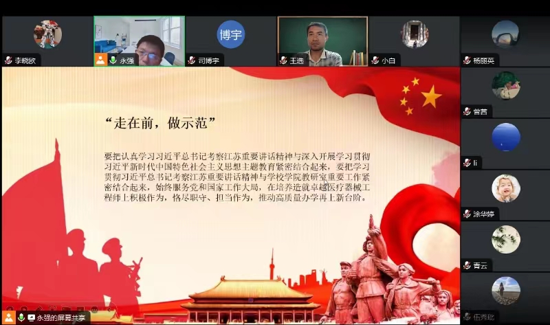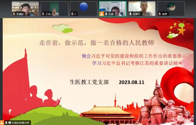 8月11日,生医教工党支部在线学习习近平总书记考察江苏的重要讲话精神与领会习近平对党的建设和组织工作作出的重要指示,此次学习由支部书记陈永强领学。