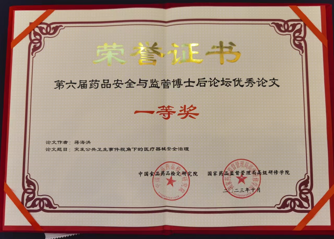 本届论坛共收到来自高等院校、监管部门和研究机构的博士或博士后撰写的论文102篇,盲审评出一等奖3名、二等奖6名、三等奖9名。公司伟德bv国际体育蒋海洪博士撰写的论文《突发公共卫生事件视角下的医疗器械安全治理》荣获一等奖,并受国家药监局雷平副局长为其亲自颁奖。