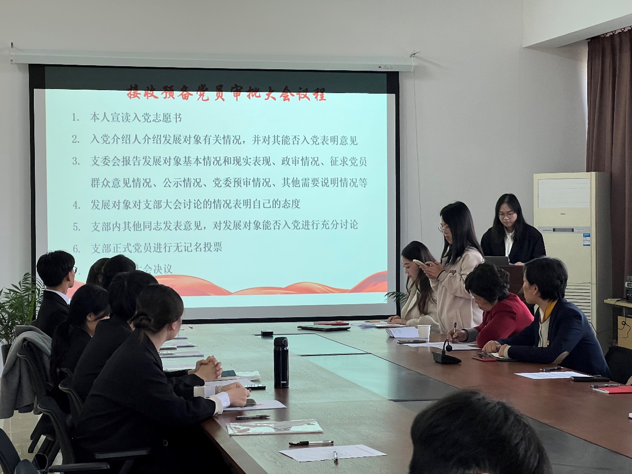 大会开始,全体起立奏唱国际歌。随后按照党员发展流程,支部对张芷晴、李成林、李芷萱、刘忻怡、辛美谦、刘宇通、施方也、李晓娅8位发展对象逐一展开讨论。首先,发展对象本人宣读《入党志愿书》,向全体党员汇报对党的认识、入党动机、本人履历、家庭成员和主要社会关系情况、现实表现及需要向党组织说明的问题。其次,两位入党介绍人向大会介绍发展对象的有关情况,并对其能否入党表明各自意见。接着,组织委员刘林艳同志代表支委会向大会报告发展对象现实表现的考察情况及综合政治审查情况。发展对象对大会讨论情况进行表态,与会党员同志纷纷发表意见,对发展对象能否入党进行讨论。最后,经支部正式党员进行无记名投票表决,大会同意接收8名同志成为中共预备党员。
