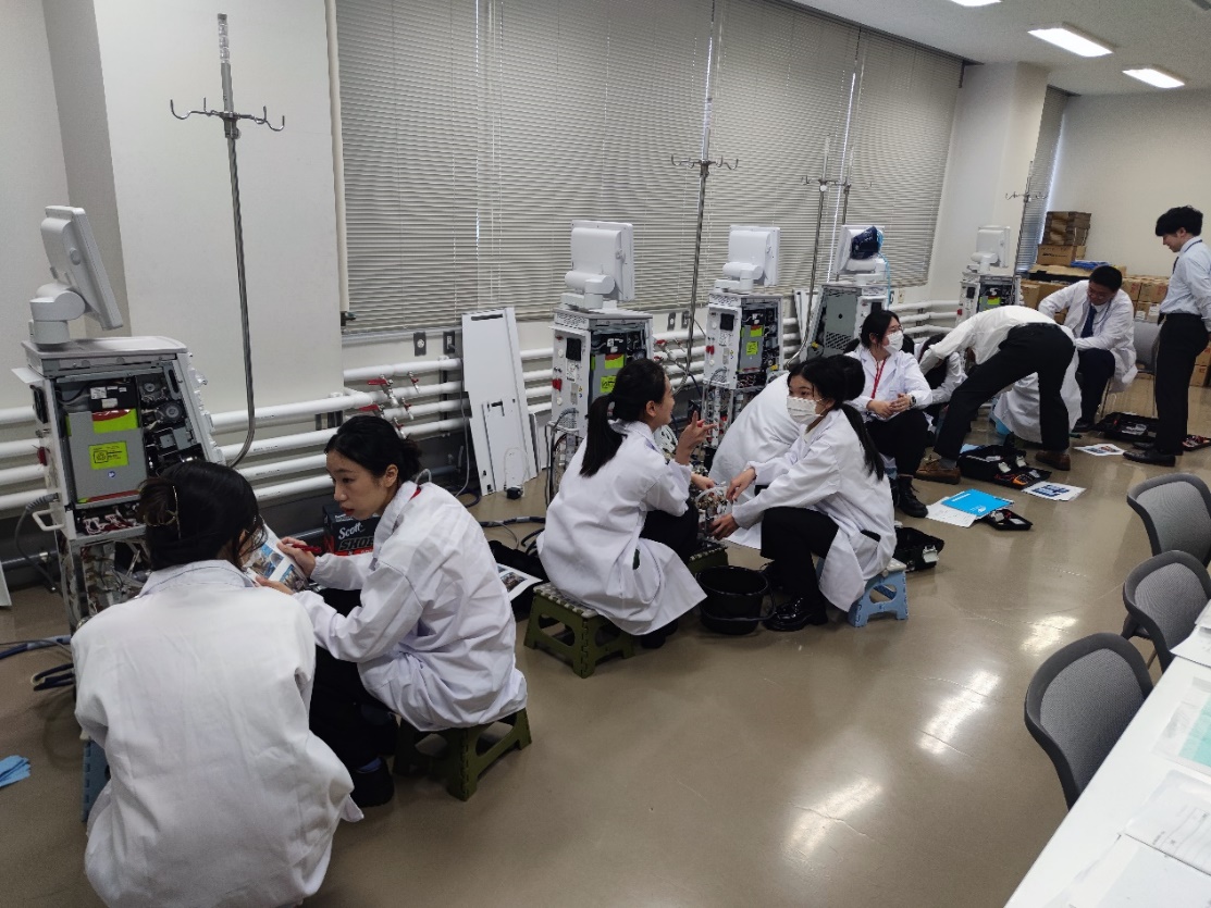 11月16至17日,师生团体在日方老师的带领下,抵达尼普洛株式会社(NIPRO)进行了血液透析技术有关的专业培训。NIPRO公司的工作人员向师生们介绍了医疗实践研修所(Institute of Medical Practice,iMEP)创建的背景和目标, 该项目旨在为医疗工作者提供全面的培训和进修机会,以提升其医疗设备的临床应用能力,并为实践研修者提供研究场所和研究课题/方向。NIPRO公司的上野老师为师生们讲授了血液透析机的专业理论知识,重点介绍了该机型硅油泵控制系统的特点(如高精度和无需保养)以及透析机的除水原理。丰富的授课知识为研修师生们日后在临床工程技术领域的实践提供了宝贵参考。在理论学习后的实践环节中,师生们实地拆解透析机,并重新安装拆卸的零部件。这不仅是理论知识的实际应用,更是对师生们动手能力的一次重要考验。培训圆满结束后,NIPRO公司为研修师生举行了血液透析研修结业仪式,并颁发结业证书,对此次学习成果予以充分的肯定。