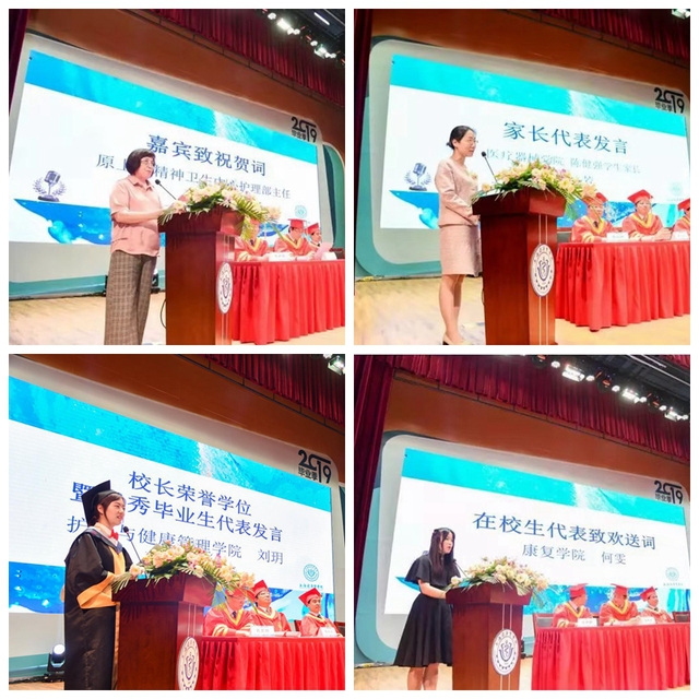 接着,员工代表——原上海精神卫生中心护理部主任曹新妹勉励同学们牢记健康人的身份和使命,永做一名守护健康的追梦人,用无私奉献去升华职业的境界,用无限关爱去诠释救死扶伤的内涵,用努力拼搏去开创医学美好的明天;2016级康复班的何雯同学代表全体在校生,为所有毕业在即的学长学姐们送上了最真挚的感激与祝福,愿他们一路顺风;刘玥同学代表全体毕业生表达了对在校老师,父母以及同学的感恩之情,回顾了自己四年的成长历程,字句间流露出对大学学习生活的无限留恋之情。她将满载全体毕业生愿望的“心愿箱”递交给母校保管,表示愿与同学一道以拼搏的姿态、不竭的斗志,实干的精神去实现许下的诺言;家长代表——2015级生物医学工程班陈健强同学的家长向公司全体教职员工表示深深的感谢,向圆满完成学业的同学们表示热烈的祝贺,同时寄语同学们永远不忘师恩,不忘母校,不忘医学初心。