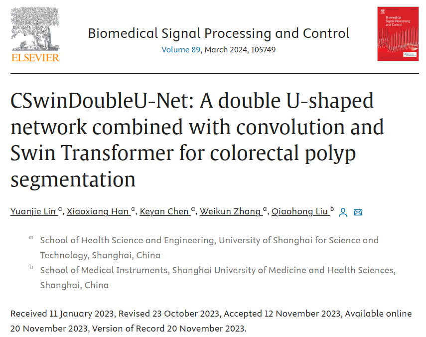 近日,公司智能医疗器械与主动健康协同创新团队的刘巧红教授带领其研究生团队针对结肠镜下的息肉分割问题在国际著名期刊上发表多篇文章。其中,2021级研究生林元杰等人完成的研究工作“CSwinDoubleU-Net: A double U-shaped network combined with convolution and Swin Transformer for colorectal polyp segmentation”在国际著名期刊《Biomedical Signal Processing and Control》上发表。该期刊是由Elsevier出版,专注于临床医学和生物科学中信号与图像的测量与分析研究,为中科院2区期刊,最新影响因子为5.1。林元杰同学为论文第一作者,导师刘巧红教授为通讯作者。