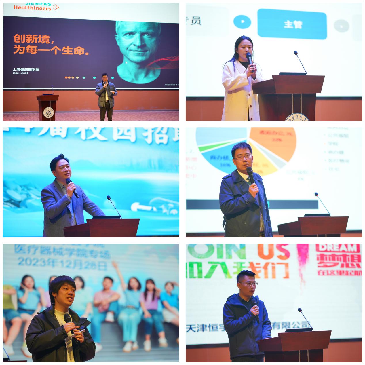 会议第二部分是企业宣讲。让毕业生高质量就业始终是公司的工作目标,为让员工企业面对面,公司主动对接联系了西门子医疗,海尔施集团,恒宇医疗,上药医疗器械,华润医药,汇成物业等公司招聘负责人,来校集中为毕业生宣讲。各参会企业招聘负责人从上海、天津、宁波、杭州等地带着岗位赶来招聘,他们依次上台宣讲,从企业规模,发展历程,员工晋升规则,薪酬福利,多彩多样的企业活动等同学们较为关心的问题为同学们进行讲解,并用已毕业学长学姐入职后的丰富案例和良好的互动带动宣讲会的氛围。