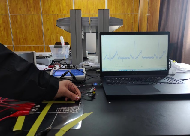 涂华婷老师寒假坚持与员工一起奋战在科研第一线,围绕柔性心电电路开发工作攻坚克难。一方面探索非均质基底表面柔性电路可控成形技术,另一方面制备柔性穿戴电子器件用于心电、脉搏、呼吸等电生理信号监测,该工作在健康监测、人机交互和机器智能感知等领域有巨大的应用前景。在涂老师的指导下,生物医学工程专业的陈子昊、张雨春两位同学已经熟练掌握样品制备、电化学性能表征、心电信号测试相关知识和方法,独立开展系列试验,其专业知识和实验动手能力得到了极大的提升。寒假期间,师生一起扎根实验室,共同发现问题、解决问题,集中时间高效解决了柔性电路与钢性硅电子元器件之间的机械兼容性问题。
