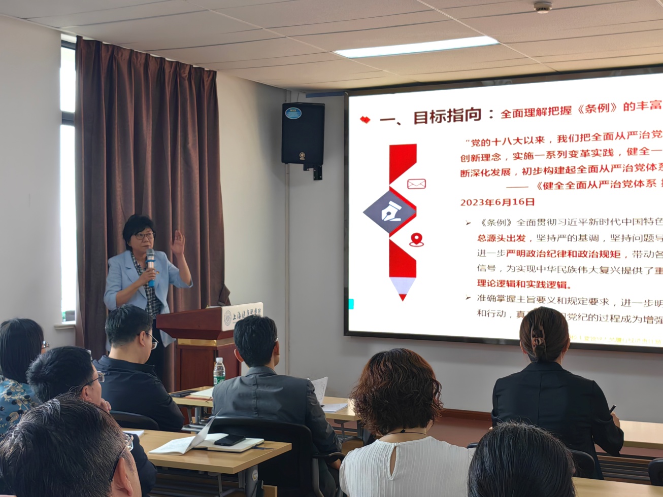 接着,在“价值意蕴,葆初心强党性”部分,于书记从“习近平总书记对长期执政的马克思主义政党建设的思考”、“包含着新时代党的建设原则性、时代性、指导性的重大思想观点”、“蕴含着丰富的道理、学理、哲理”、“以伟大自我革命引领伟大社会革命”四个方面指出党纪学习教育的价值意蕴,引导与会党员教师深刻理解党的自我革命是跳出历史周期率的第二个答案。