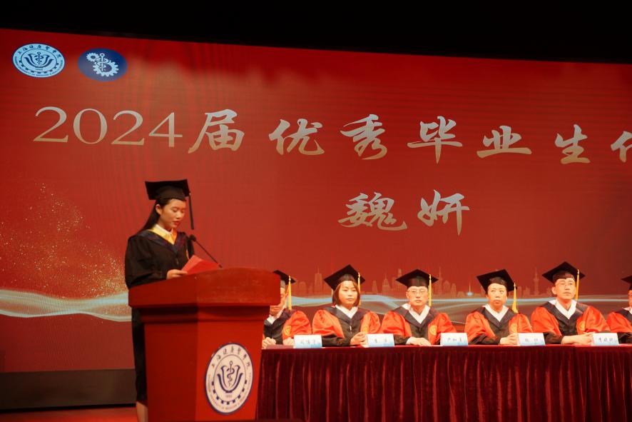 2024届优秀毕业生魏妍作为代表发言。她回忆了大学四年的学习、科研和实习经历,对老师的帮助和公司的悉心培育表达了感激之情。在公司这片沃土上,她接受了系统的专业知识教育,培养了扎实的实践技能,锤炼了坚定的意志品质,也收获了深厚的同窗情谊。使她成长为理想坚定、热爱知识、敢于创新、勇往直前的新时代青年。她表示自己会谨遵教诲,以“厚德至善,健行康民”的品格继续学习生活。最后她祝愿同学们在身处时代洪流之时,仍能听从内心的召唤,永远是肩上飞扬有风、心似滚烫火焰的有梦少年。
