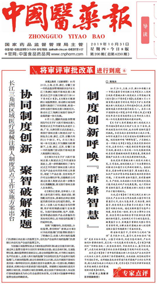 10月31日,我国医药领域最有影响力的权威报刊《中国医药报》在头版头条登载了公司医疗产品管理专业主任蒋海洪副教授的专家点评文章。他以《制度创新呼唤“群蜂效应”》为题,以医疗器械注册人制度全程参与者的身份对10月29日上海、江苏、浙江和安徽等一市三省药品监督管理局联合发布的《长江三角洲区域医疗器械注册人制度试点工作实施方案》进行了专业点评。至此,作为国家药品监督管理局的机关报,《中国医药报》在10月里已经连续两次在头版头条发表公司医疗产品管理专业教师的相关文章。