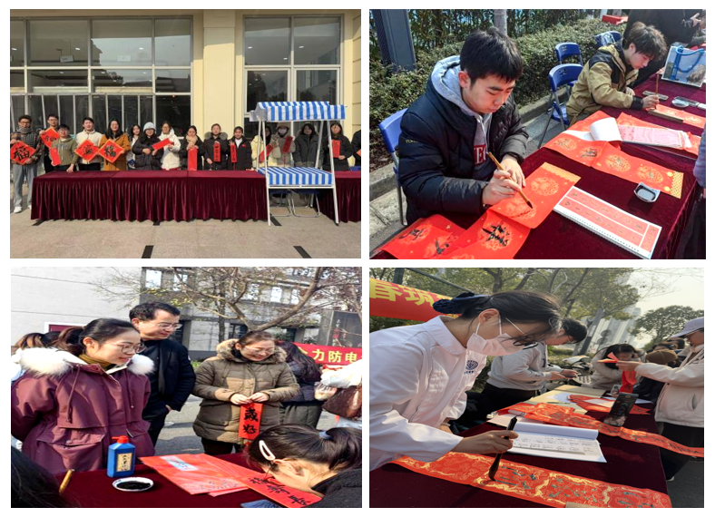 同时,春联的书写也成为了活动的一大亮点。鲜红的春联在阳光下被映衬得格外耀眼,师生们以笔为媒,以纸为介,将对新年的美好希望和祝福一笔一划地融入春联之中。每一副春联都是对新年的期待,每一句祝福都是对未来的憧憬。活动现场洋溢着浓厚的节日气息,欢笑声、畅谈声、祝福声,声声交织。同学们或驻足欣赏,或亲自挥毫泼墨,将墨韵与愿景相融合,体验着书写春联的乐趣,整个校园都沉浸在一片欢乐祥和的节日气氛之中。