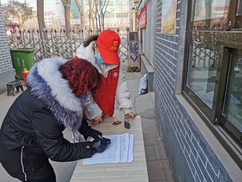 天刚微亮,她穿上厚厚的棉衣,带上口罩和防护手套,穿过寂静的街道,早上6点准时到达工作地点。准备好消毒液、调试好测温计、摆好登记本……一切准备就绪,正式开始“守门员”的一天。天虽冷,心却定,她并未因天气影响而懈怠,一丝不苟的完成工作。