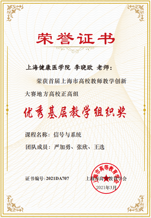 7. 李晓欧团队,“首届上海市高校教师教学创新大赛” 优秀基层教学组织奖,2021年。