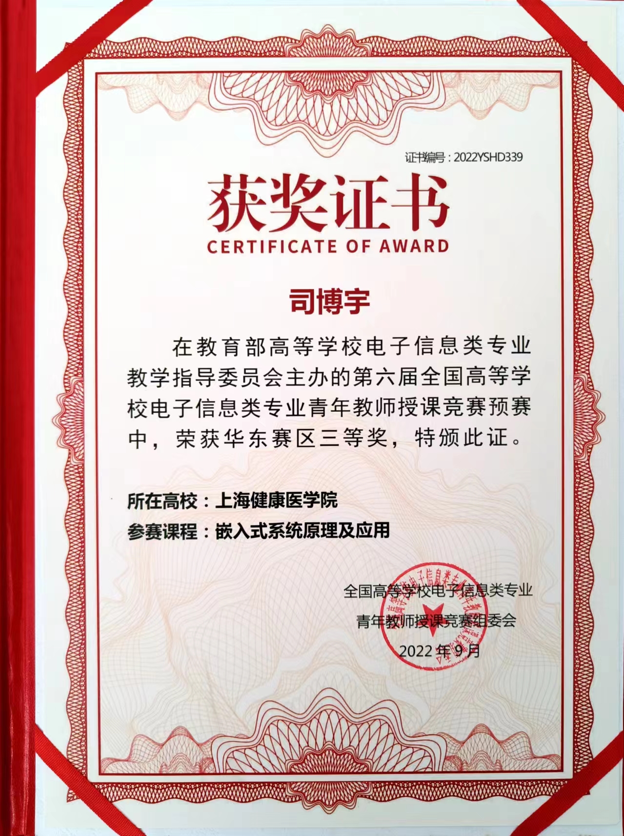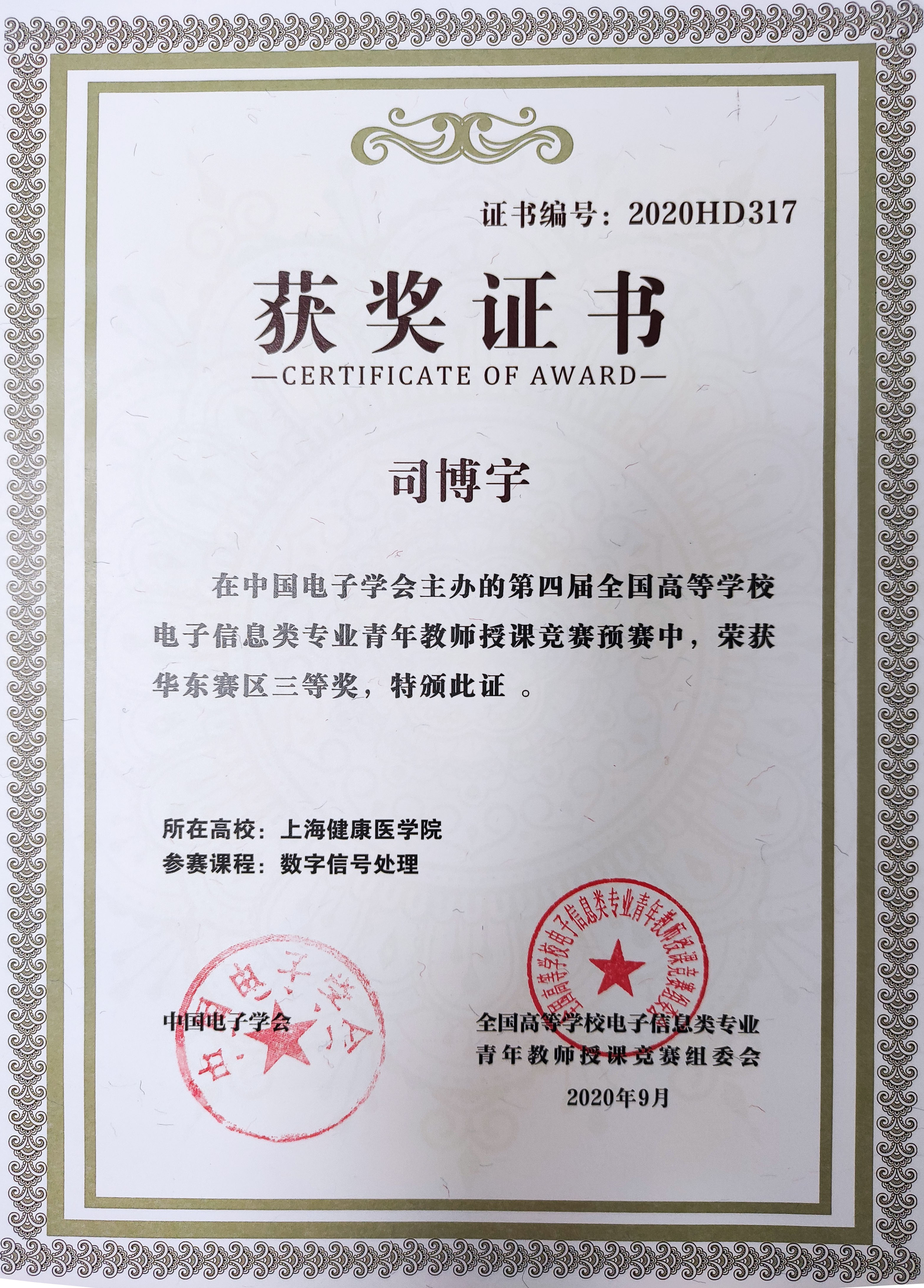 4. 司博宇,第六届全国高等公司电子信息类专业青年教师授课竞赛华东赛区三等奖,2022年。