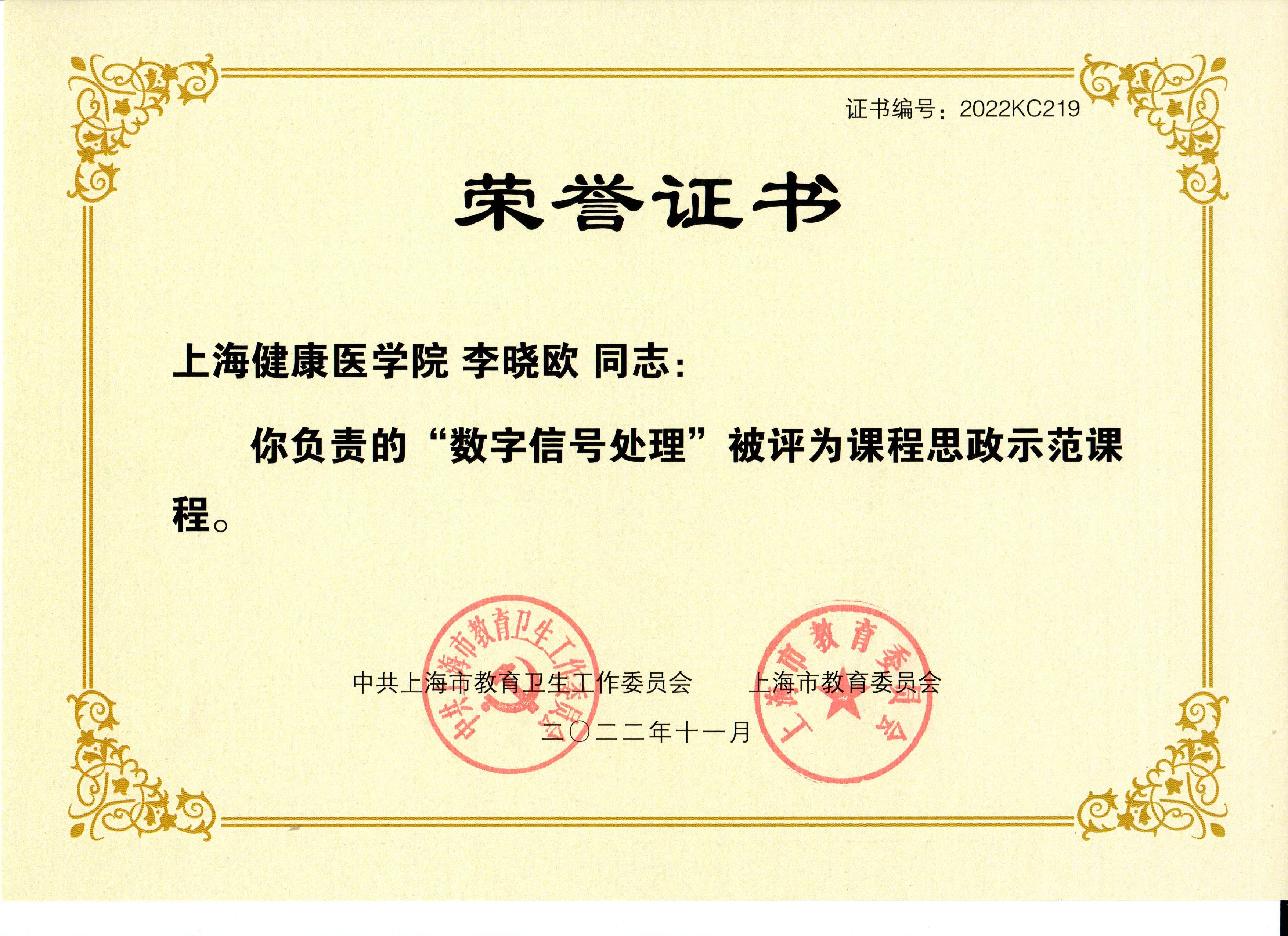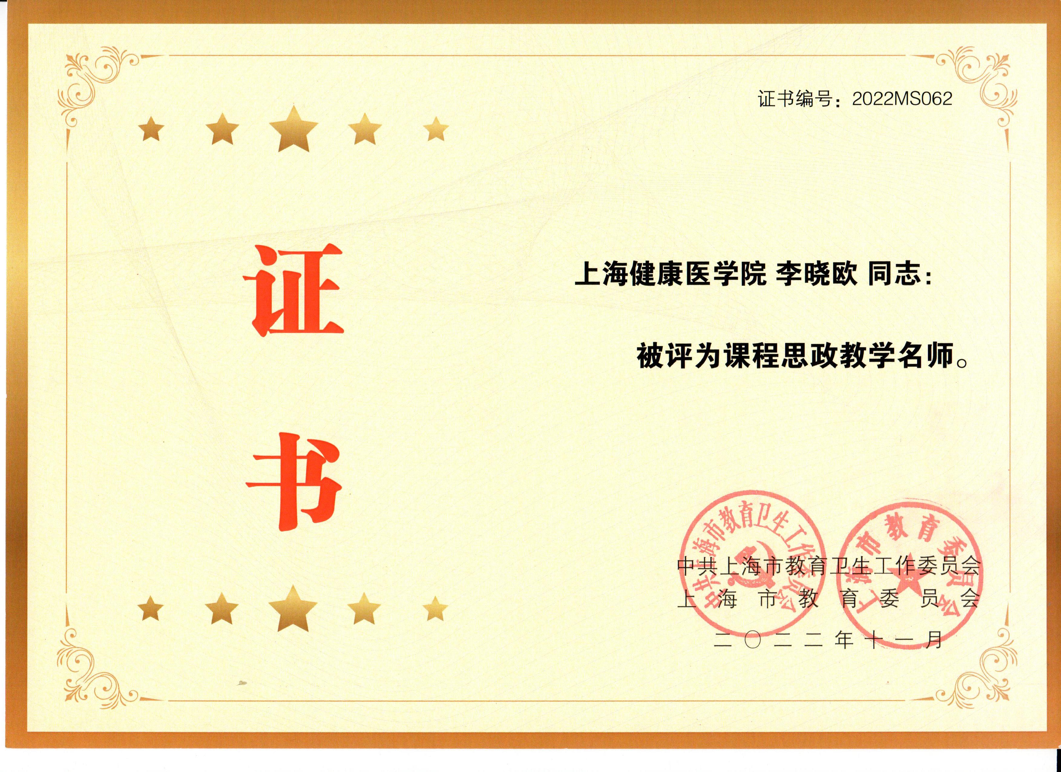 3. 李晓欧,上海市课程思政教学名师,2022年。