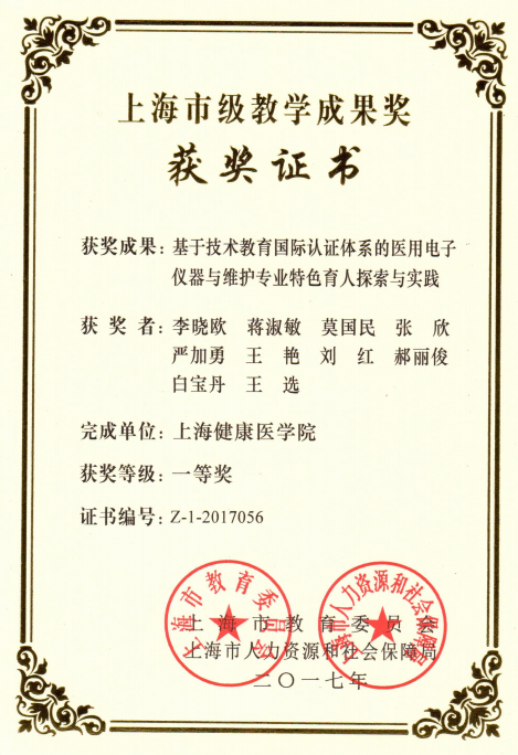 2. 《基于技术教育国际认证体系的医用电子仪器与维护专业特色育人探索与实践》上海市级教学成果奖,2017年。团队成员:李晓欧,蒋淑敏,莫国民,张欣,严加勇,王艳,刘红,郝丽俊,白宝丹,王选。