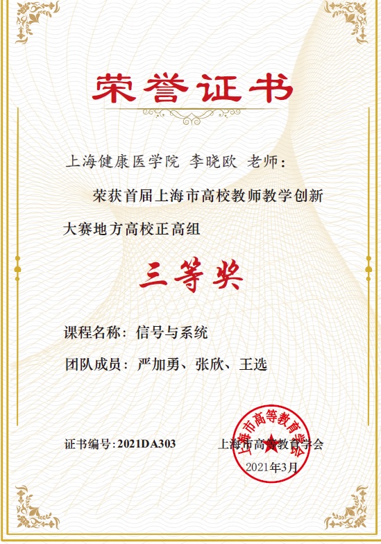 12. 《数字信号处理》,上海市一流本科课程,2021年。负责人:李晓欧。教学团队:张欣、严加勇、司博宇、白宝丹、朱耿。