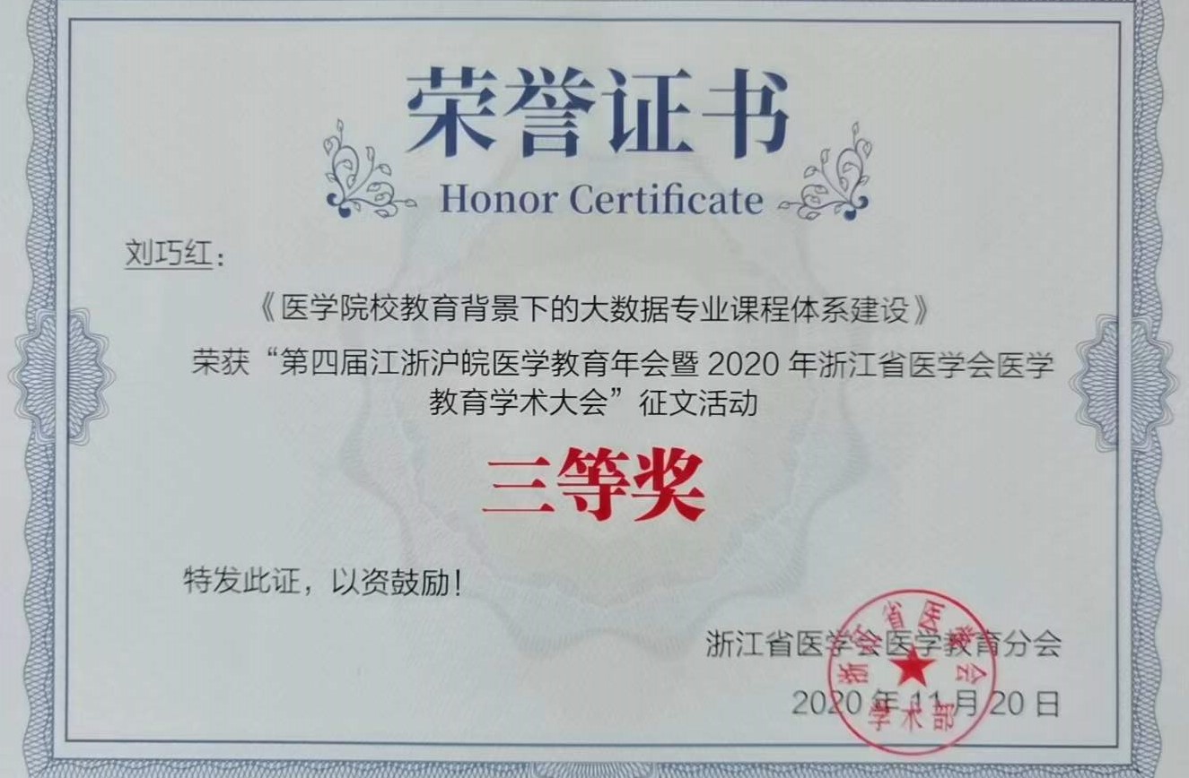 8. 刘巧红,第四届江浙沪皖医学教育年会征文三等奖,2020年。