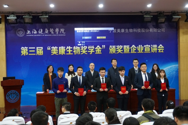11月16日上午,伟德bv国际体育“第三届美康生物奖学金颁奖暨校园宣讲会”在北苑200人报告厅举行。员工处副处长童清、医疗器械公司党总支书记刘敏娟、宁波美康生物科技股份有限公司技术部经理管时捷、招聘经理刘永祥、技术部主管颜秀琴出席了此次典礼,颁奖典礼由公司党总支副书记高晓霞主持。