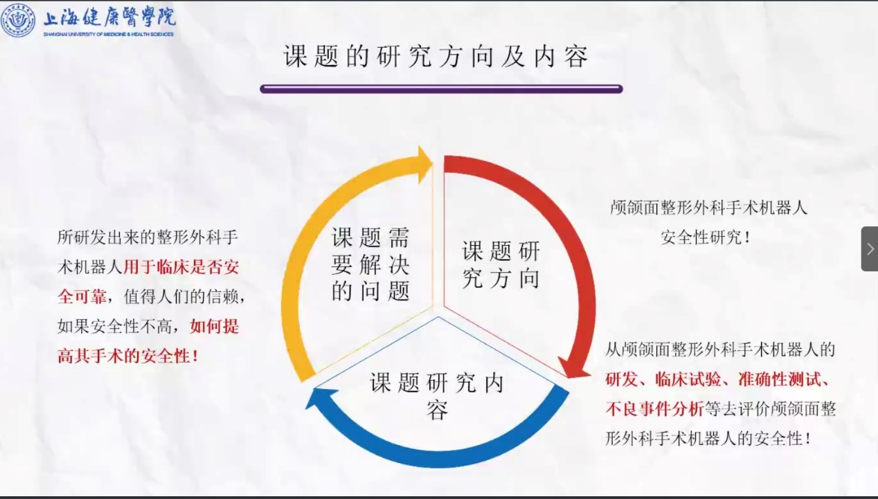 接着张博士通过讲解颅颌面整形外科手术机器人的研发过程,告诉大家整形外科临床中手术机器人是如何解决一些实际问题的。同时也向我们详细介绍了团队在课题上的研究方向与内容,包括一些已完成的实验与研究。