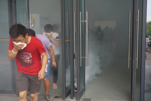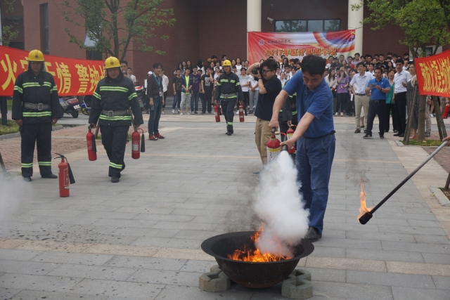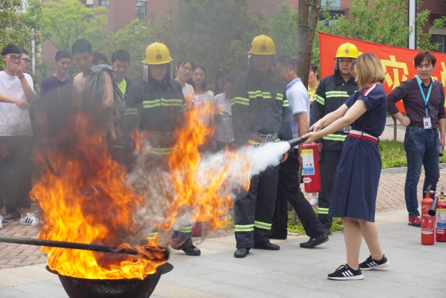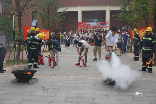 本次演练活动分为逃生演习和灭火演练两个阶段。演练假设18号楼二楼因电线短路引发火灾,烟气浓密,警报响起。时值二、三楼有200多名师生正在参加实训课程,形势万分危急,公司安保人员及义务消防队员立即组织人员疏散,并拨打119报警电话。员工们在老师的组织下,用湿毛巾捂住口鼻,按照既定路线迅速而有序地撤离至17号楼前空地广场。逃生演习结束后,公司义务消防队员对火灾发生时如何及时求救、逃生等安全防范知识及灭火器的使用方法等作了详细的讲解,并为全体师生现场演示了如何使用灭火器对初期火灾进行扑救。接着,在场的每名师生在消防员的指导下,分两列纵队进行了利用灭火器灭火的操作演练。
