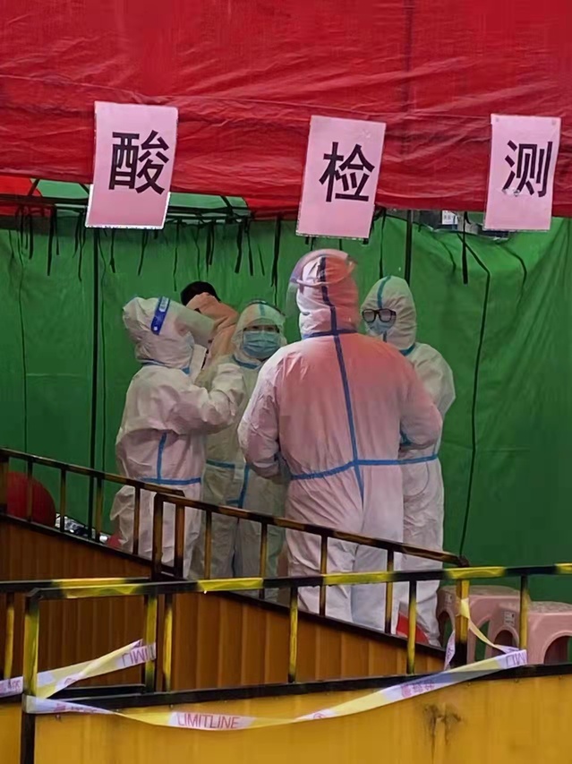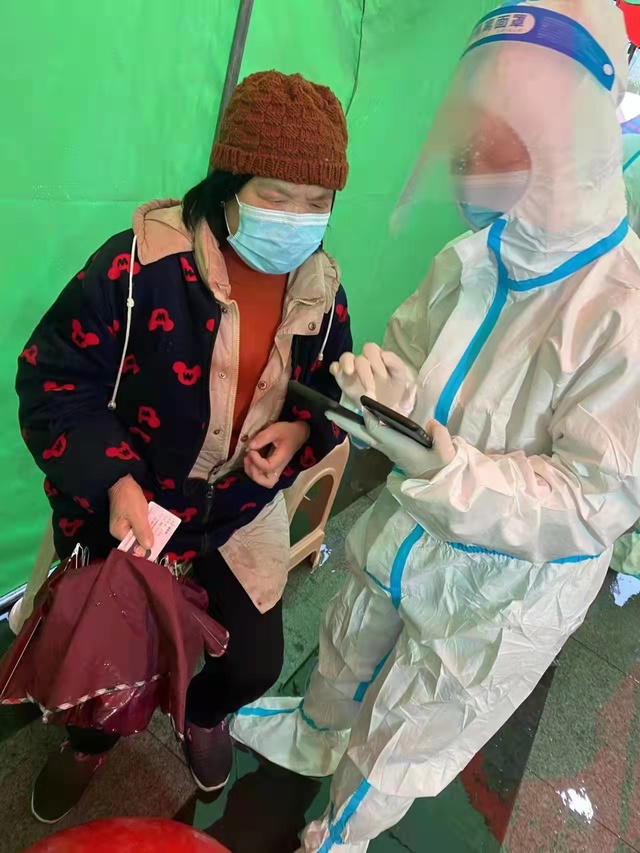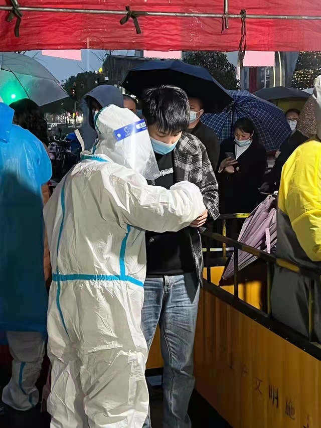 3月20日,在浦东新区新场镇新环广场核酸检测点,身穿大白的曾冬冬老师站在入口处,招呼居民有序检测核酸。她的工作任务是其他志愿者们一起,维持核酸检测大棚入口秩序,提示居民准备好核酸检测预约码,同时用自己的手机帮助没有预约码的老人预约核酸检测,再请排在队伍里的愿意帮忙的年轻人帮忙拍预约码的照片顺便带老人过去检测核酸。从早上6:50开始一直到晚上最后一个居民结束核酸检测,除了吃午饭和上厕所,她一直坚守在岗位上。“非常累,非常冷,袜子又全湿了,腰酸死了,嗓子有点疼”,这是她最真实的感受;“大家不要着急,核酸检测很快的,预约码准备好,下雨天有点滑,注意安全”,这是她重复最多的一句话;“这是我声音最温柔的一天,我服务了很多熟悉的邻居”,她自豪地跟人讲:“一天,粗算下来近万人走进了这个核酸检测大棚,没有发生混乱,不容易的!”