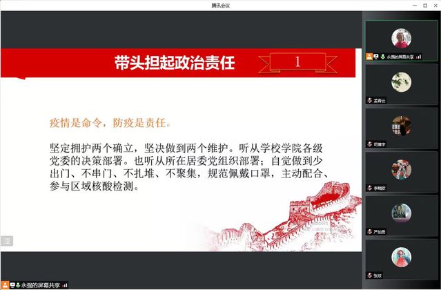 陈永强带领全体与会党员学习了《在大战大考中彰显特殊责任、特殊担当——致全市共产党员的一封信》,号召支部党员要带头担起政治责任,要带头发挥党员作用,要带头联系服务群众,越是特殊时期,越要扛起特殊责任、拿出特殊担当,咬紧牙关、一鼓作气,坚决打赢疫情防控这场大仗硬仗。会上,公司书记李晓欧强调,要深入贯彻习近平总书记重要讲话和指示批示精神,坚决落实和积极响应上海市委市政府的各项决策部署和号召,迎难而上、尽锐出战,全力筑牢防疫抗疫战斗堡垒。各位党员也纷纷表示,我们都会做好本职工作的同时,在疫情需要的地方勇担使命。一方面公司产品、关爱员工。有困难也会克服,与奋斗在公司第一线的各位老师,并肩作战,保质保量完成公司和公司布置的各项工作。另一方面,会在生活社区做好党员先锋带头作用,助力所在区域防疫,共克时艰。