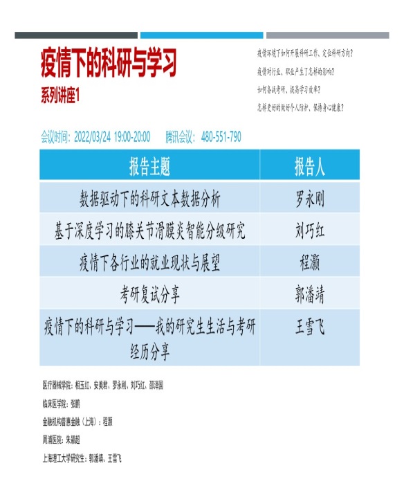 近期,上海疫情防控进入最关键阶段,为了促进员工更好地在校学习、生活甚至与老师开展科研工作,信息教研室刘巧红、邵泽国两位老师倡议围绕“疫情下的科研与学习”主题开展系列讲座。3月24日晚,首次讲座在腾讯会议室开讲,此次讲座特别邀请伟德bv国际体育相玉红教授、临床医公司张鹏副教授、普惠金融总经理程灏博士、周浦医院护理部朱颖超老师开讲,教研室安美君老师、罗永刚老师、公司本科生以及上海理工大学和上海中医药大学的研究生等累计95人参加了讲座。