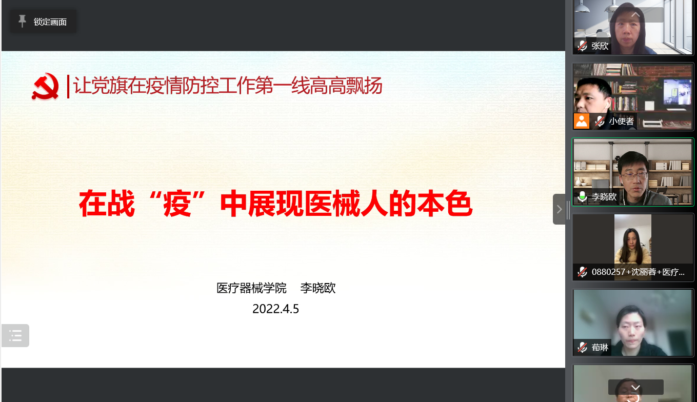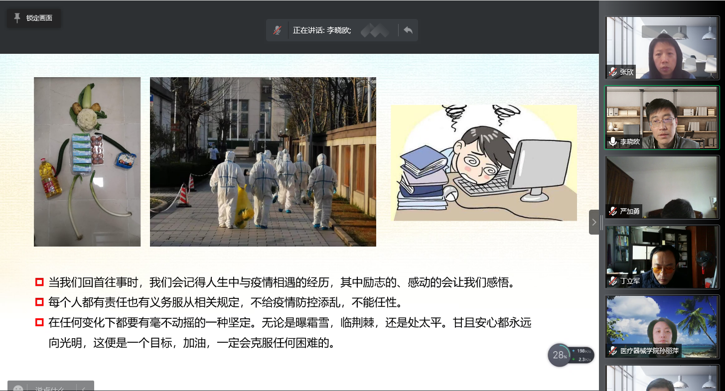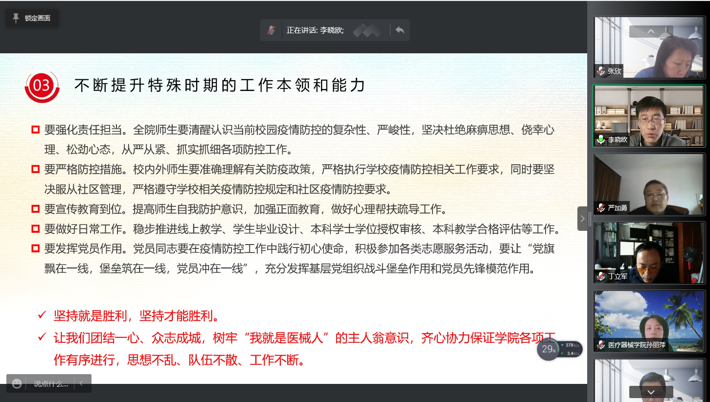 在“不断提升特殊时期的工作本领和能力”部分,李晓欧书记强调,突如其来的疫情,考验的不仅是党员干部的初心和使命、作风和意志,更是本领和能力,要求全体党员“要强化责任担当,清醒认识当前校园疫情防控的复杂性、严峻性,坚决杜绝麻痹思想、侥幸心理、松劲心态,从严从紧、抓实抓细各项防控工作”、“要严格防控措施,准确理解有关防疫政策,严格执行公司疫情防控相关工作要求,同时要坚决服从社区管理,严格遵守公司相关疫情防控规定和社区疫情防控要求”、“要宣传教育到位,提高师生自我防护意识,加强正面教育,做好心理帮扶疏导工作”、“要做好日常工作,稳步推进线上教学、员工毕业设计、本科学士学位授权审核、本科教学合格评估等工作”、“要发挥党员作用,党员同志要在疫情防控工作中践行初心使命,积极参加各类志愿服务活动,要让‘党旗飘在一线,堡垒筑在一线,党员冲在一线’,充分发挥基层党组织战斗堡垒作用和党员先锋模范作用”,树牢“我就是医械人”的主人翁意识,齐心协力保证公司各项工作有序进行,思想不乱、队伍不散、工作不断。