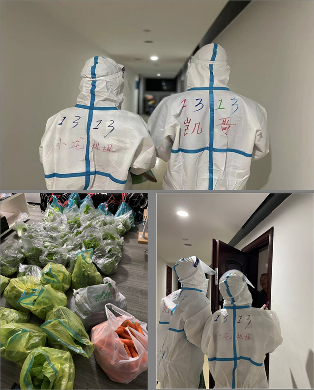 绿地乐和城是商业楼,没有居委会直接管理,两栋楼有500户左右的人家,如果挨家挨户敲门不仅工作量大,人力不足效率低下,并且也打扰到普通居民的生活,在物业的帮助下,潘凯凯以员工的身份赢得居民信任,通过微信群聊对楼栋老人的居住情况进行了统计,同时了解到部分老人需要药物。接着,他通过学长提供的渠道,在自有资金有限的情况下,按照分配物资至少能生活三天以上的捐赠方案采购了杭白菜,生菜,黄瓜,胡萝卜等100多斤蔬菜(同时购买了部分药物),为了做好疫情防控,潘凯凯对物资商家进行了多次辩认、购买了消杀物资和防护服并向物业部门提前报备。经过前期的辛苦付出,最终成功为20户老人进行了物资配送。