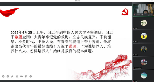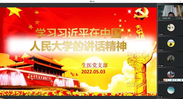 5月3日,晚上七点,伟德bv国际体育生医党支部在腾讯会议平台上就习近平总书记在中国人民大学发表重要讲话展开学习与交流,支部全体党员参加了这次活动。