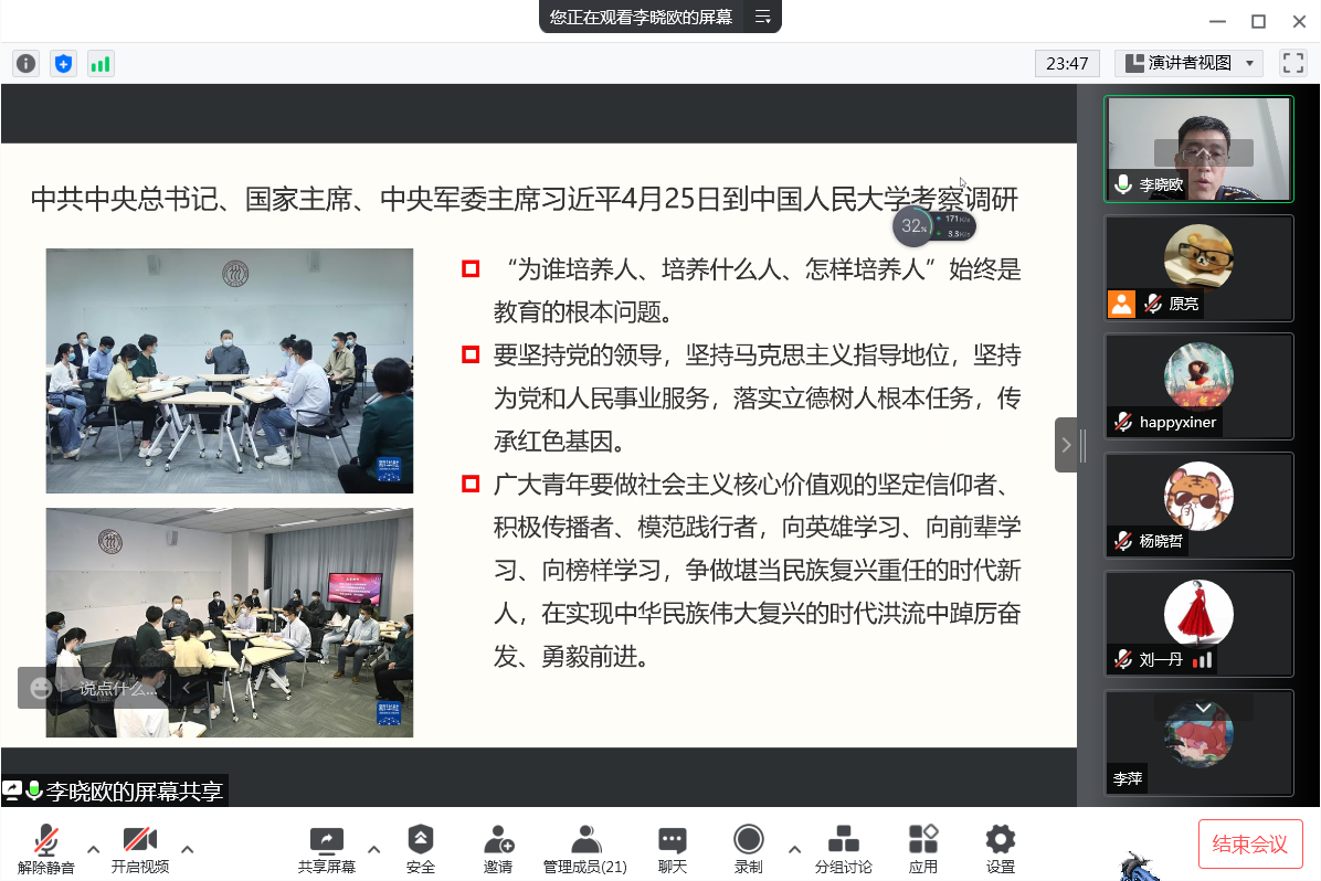 最后,李晓欧书记和参会人员再次共同学习了习近平总书记4月25日在中国人民大学考察调研时的讲话精神,希望全体教师坚持立德树人、德技并重,保证“育人与育才统一”,尤其是疫情期,要坚持“教学法更贴近员工”原则,合理利用多种媒体手段,注重传统方法与信息化手段结合, 全面提升教学质量。