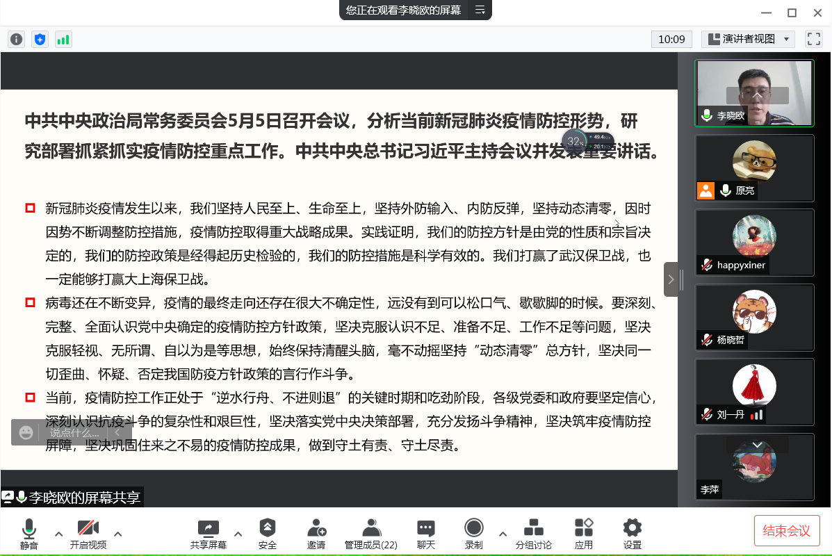 首先,李晓欧书记带领参会人员学习了“习近平总书记5月5日在中共中央政治局常务委员会上关于疫情防控的重要讲话精神”、“上海市委书记李强5月5日在传达学习贯彻习近平总书记主持召开的中共中央政治局常务委员会会议精神时提出的工作要求”,要求公司各党支部和师生党员要守土有责、守土尽责,继续发扬不怕疲劳、连续作战的精神,冲锋在前、顽强拼搏,以时不我待的精神、分秒必争的行动抓实抓细教学科研、人才培养、疫情防控等各项工作,发挥好战斗堡垒和先锋模范作用。