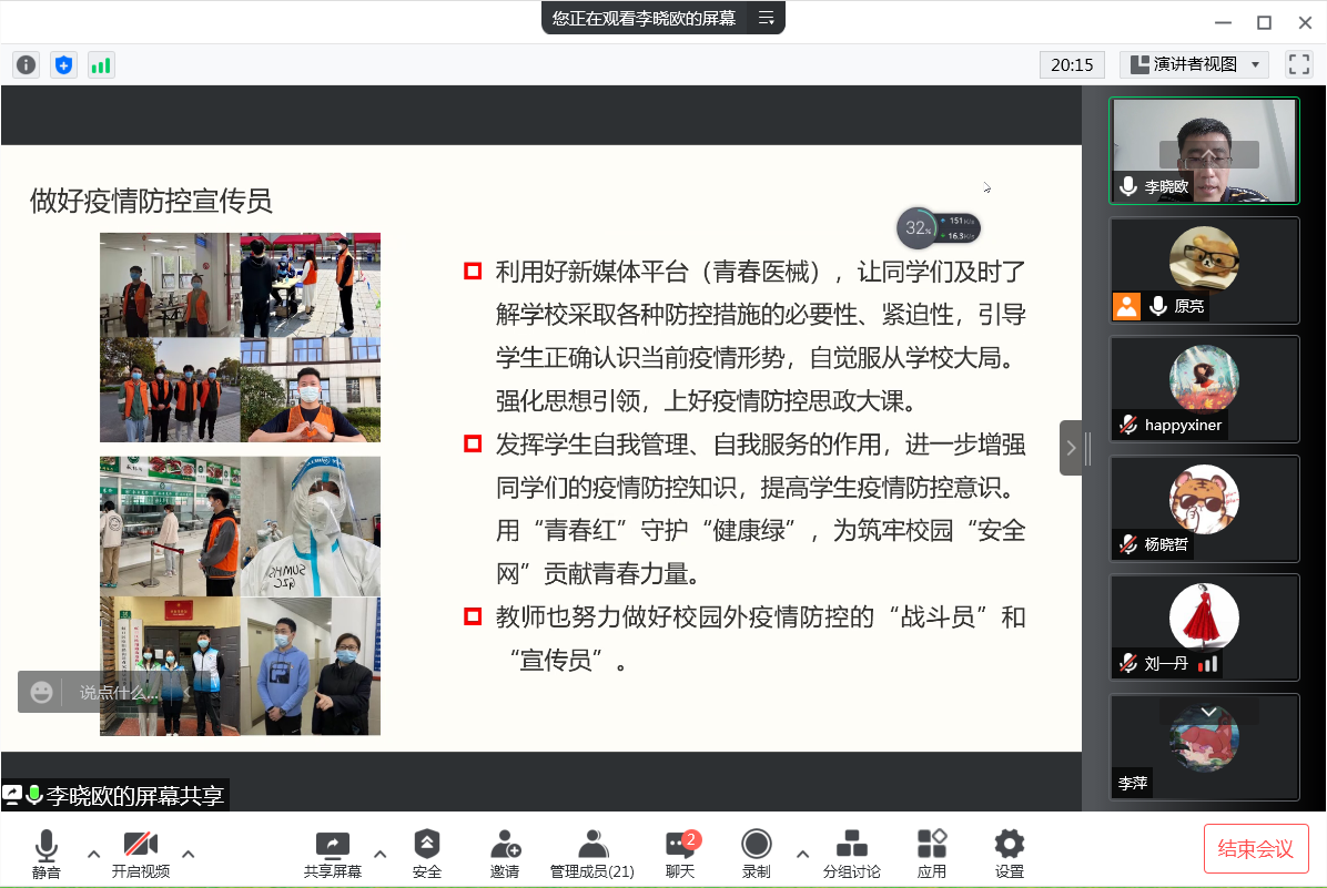 接着,李晓欧对校内外党组织和党员提出号召,不仅要做好疫情防控宣传员,“利用好新媒体平台(青春医械),让同学们及时了解公司采取各种防控措施的必要性、紧迫性,引导员工正确认识当前疫情形势,自觉服从公司大局;强化思想引领,上好疫情防控思政大课;发挥员工自我管理、自我服务的作用,进一步增强同学们的疫情防控知识,提高员工疫情防控意识;用‘青春红’”守护‘健康绿’,为筑牢校园‘安全网’贡献青春力量”,而且要做好疫情防控护航员,“留守校园的教师(12人次)秉持着‘关键时刻冲得上去,危难关头豁得出来’的信念,勇于担当,勇于奉献;把所需资源配置到第一线,把关心关爱汇聚到第一线,用心守护校园的安全有序,用爱守护员工的生命健康;辅导员是员工思想的引导员,引导同学们提高政治认识,提升共情能力;校外师生志愿者(下沉干部),他们舍小家为大家,用非凡的行动力和凝聚力见证了勇者无惧,践行了使命担当”。