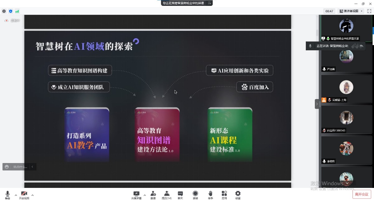 本次研讨会,首先由杨金华从学科知识图谱建设的时代背景、学科知识图谱建设的方法与实践和一门AI课程的诞生三个方面进行AI课程建设背景、方法和案例的介绍和经验分享。然后大家就专业课程进行AI课程建设的必要性、关键点和工作量等展开了热烈的讨论。