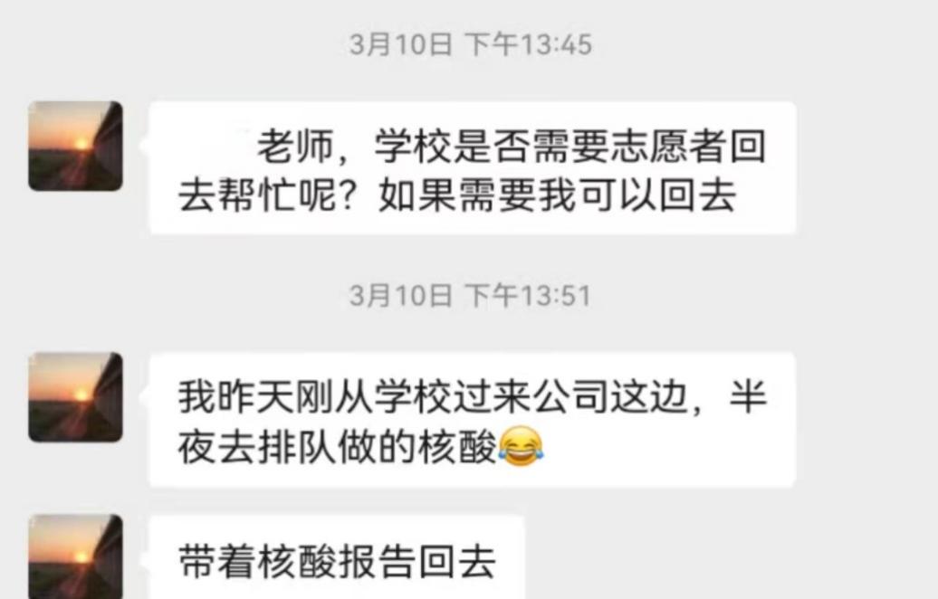 作为一名员工党员以及毕业班员工,本在实习单位工作的张路安同学听闻公司需要疫情防控志愿者,毫不犹豫地和单位领导提出了申请,同时主动地向公司老师申请返校支援,在人民需要的时候挺身而出是一名党员义不容辞的责任。在公司疫情防控过程中担任了南苑保障组的组长,为其他防控小组提供物资(志愿者服装、口罩,饮用水等)以及人员上的支援,同时作为曾志愿者工作部部长,也与此次防控的南苑指挥交流了经验,在这几天的集中核酸检测中,不断优化流程,圆满完成了任务。