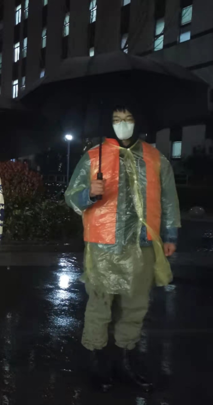 在这次公司严格管理期间,21级生物医学工程专升本班的谢柯同学响应公司号召,担任南苑夜间巡逻组的小组长,主要负责南苑夜间巡逻。3月21日召集的志愿者巡逻队当晚就进行南苑的巡逻,虽然天气情况非常恶劣,雨水打湿了全身,但他们没有退缩严格按照计划完成了当天的工作。校园封闭给大家带来了很多的困扰,一位位志愿者同学挺身而出,让大家的生活更便利。他作为一名退伍老员工始终站在一线,充分发扬不怕苦不怕累的精神。