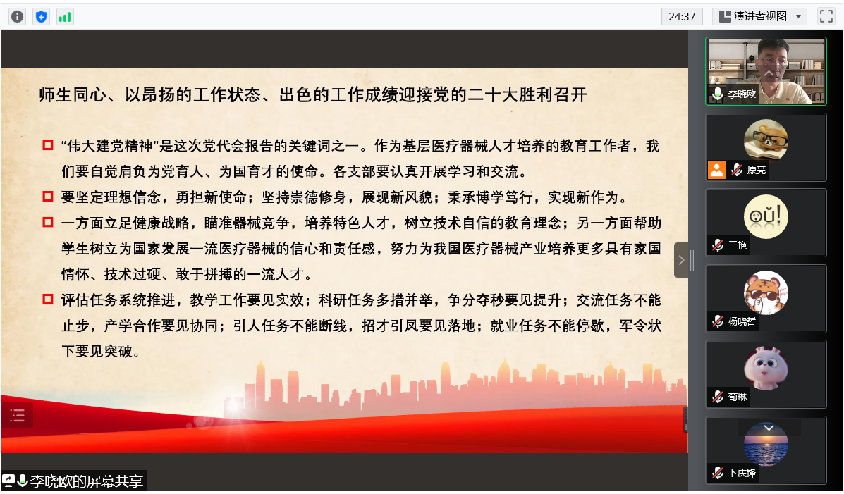 7月2日,医疗器械公司党总支通过线上组织召开中心组(扩大)会议,专题学习贯彻市第十二次党代会精神,公司党总支委员、各党支部书记、团总支书记、教研室主任、科级干部、工会主席及各党支部委员等参加会议,会议由公司党总支李晓欧书记主持。