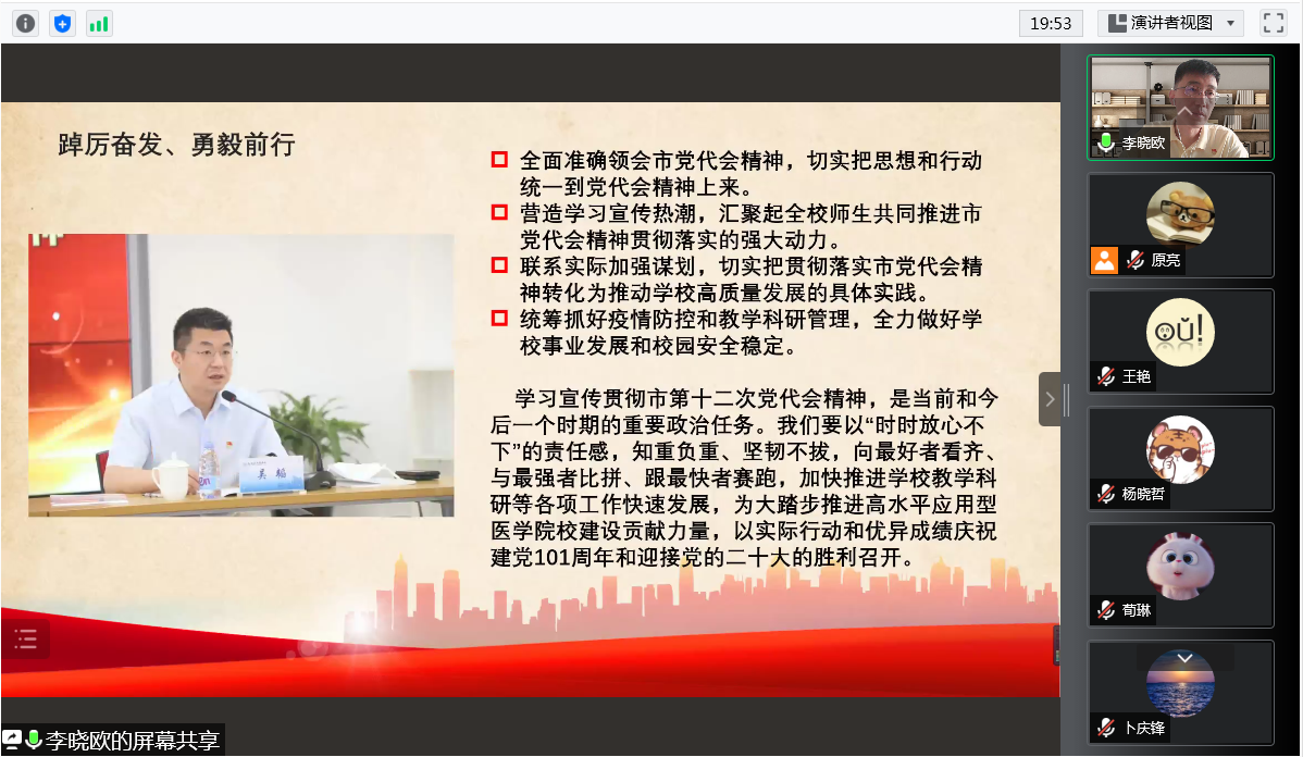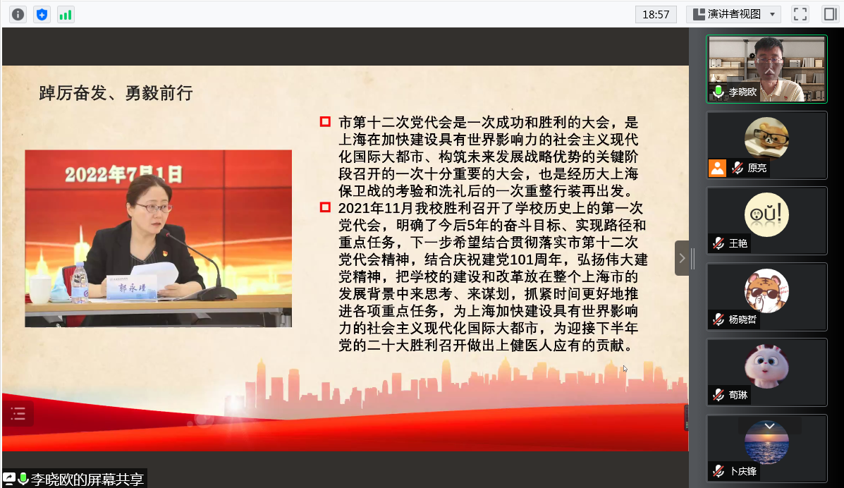 接着, 李晓欧传达了7月1日公司党委理论学习中心组(扩大)学习会精神,公司党委郭永瑾书记指出“2021年11月公司胜利召开了公司历史上的第一次党代会,明确了今后5年的奋斗目标、实现路径和重点任务,下一步希望结合贯彻落实市第十二次党代会精神,结合庆祝建党101周年,弘扬伟大建党精神,把公司的建设和改革放在整个上海市的发展背景中来思考、来谋划,抓紧时间更好地推进各项重点任务,为上海加快建设具有世界影响力的社会主义现代化国际大都市,为迎接下半年党的二十大胜利召开做出上健医人应有的贡献”,吴韬董事长强调“学习宣传贯彻市第十二次党代会精神,是当前和今后一个时期的重要政治任务。全校师生要深刻理解和准确把握市第十二次党代会的精神实质,以强烈的政治责任感和使命感认真学习领会,深刻理解把握,精心谋划部署。我们要以‘时时放心不下’的责任感,知重负重、坚韧不拔,向最好者看齐、与最强者比拼、跟最快者赛跑,加快推进公司教学科研等各项工作快速发展,为大踏步推进高水平应用型医公司校建设贡献力量,以实际行动和优异成绩庆祝建党101周年和迎接党的二十大的胜利召开”,这激励着公司教师要踔厉奋发、勇毅前行。