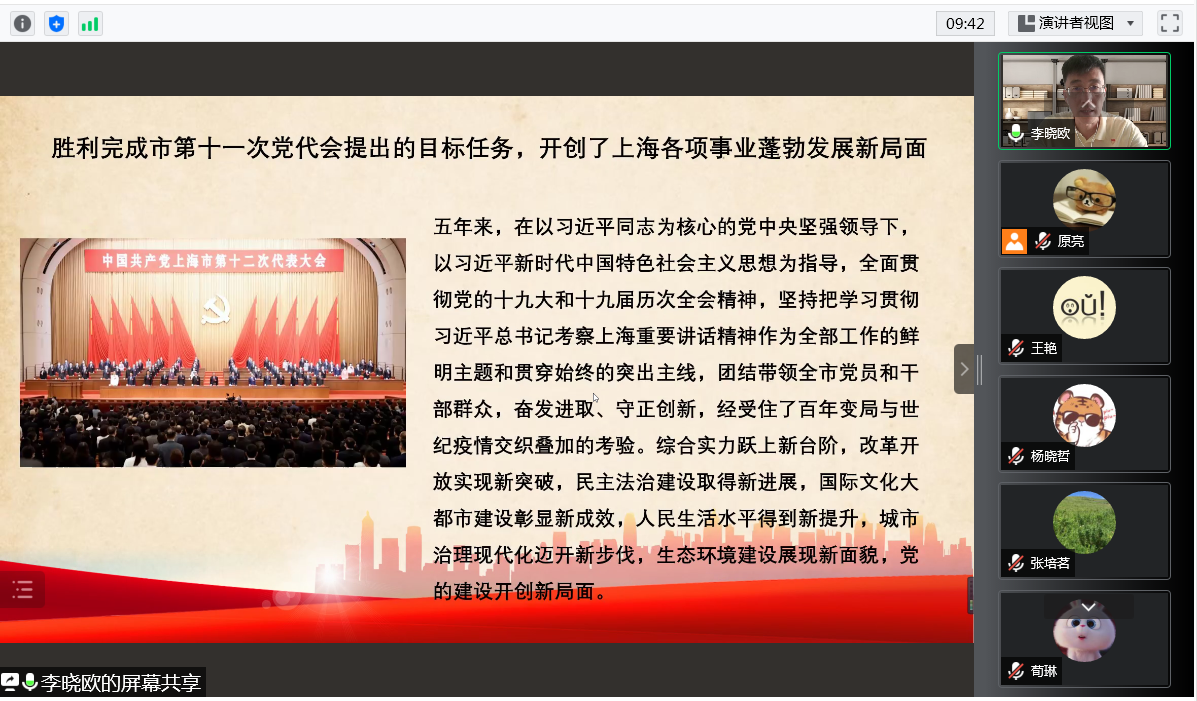 首先, 李晓欧领学李强书记的报告《弘扬伟大建党精神 践行人民城市理念 加快建设具有世界影响力的社会主义现代化国际大都市》。“奋斗充满艰辛,成就令人鼓舞”,牢记嘱托、砥砺奋进的五年所取得的成绩、两年多来抗疫斗争的实践特别是大上海保卫战,使我们更加深刻地认识到,中国特色社会主义具有无可比拟的制度优势;“实干成就事业,奋斗创造未来”,上海已按下加快建设具有世界影响力的社会主义现代化国际大都市按钮,明确重点任务、抓住关键环节,以各领域各方面的工作突破开创事业发展新局面;伟大建党精神是中国共产党的精神之源,为立党兴党强党提供了丰厚滋养,以伟大建党精神引领新时代党的建设新的伟大工程。